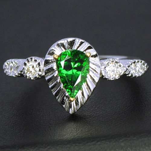14k Pure White Gold Natural Top Green 1.16 cts Tsavorite Garnet Pear Cut Gemstone Diamond Ladies Engagement Wedding Designer Ring